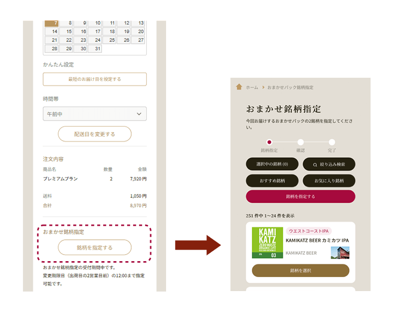 人気銘柄や生産数が少ない銘柄は、入荷待ちにより、一時的に銘柄指定画面から非表示となっている場合がございます。あらかじめご了承ください。