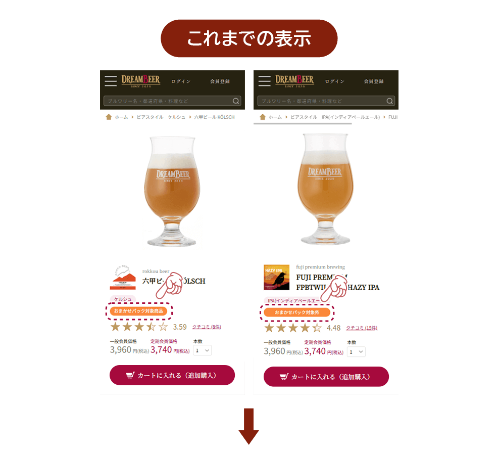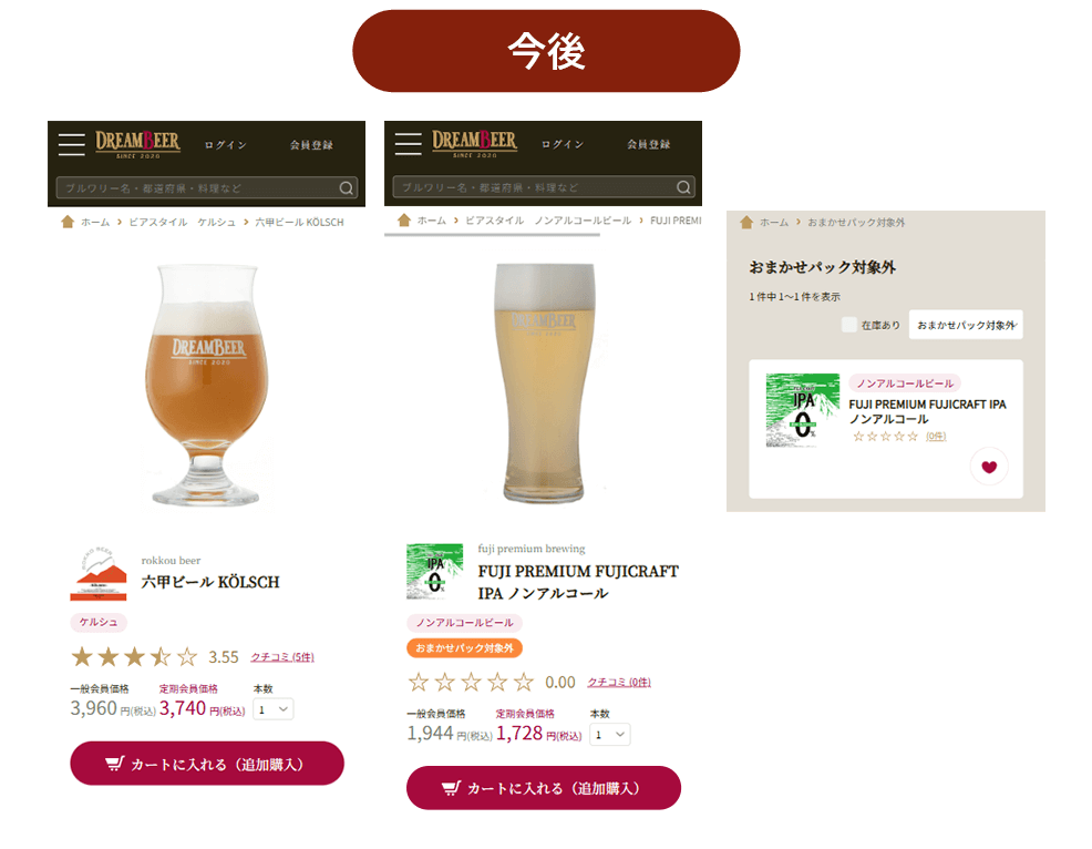 こちらの改善策として、在庫状況に応じた一時的なおまかせパック対象/対象外の切り替え表示を取りやめることにいたしました。商品アイテム数も大幅に拡充されており、今後は、商品の価格や性質上、常におまかせパック対象とならない商品(ノンアルコール等)のみを「おまかせパック対象外」と表示することとさせていただきます。